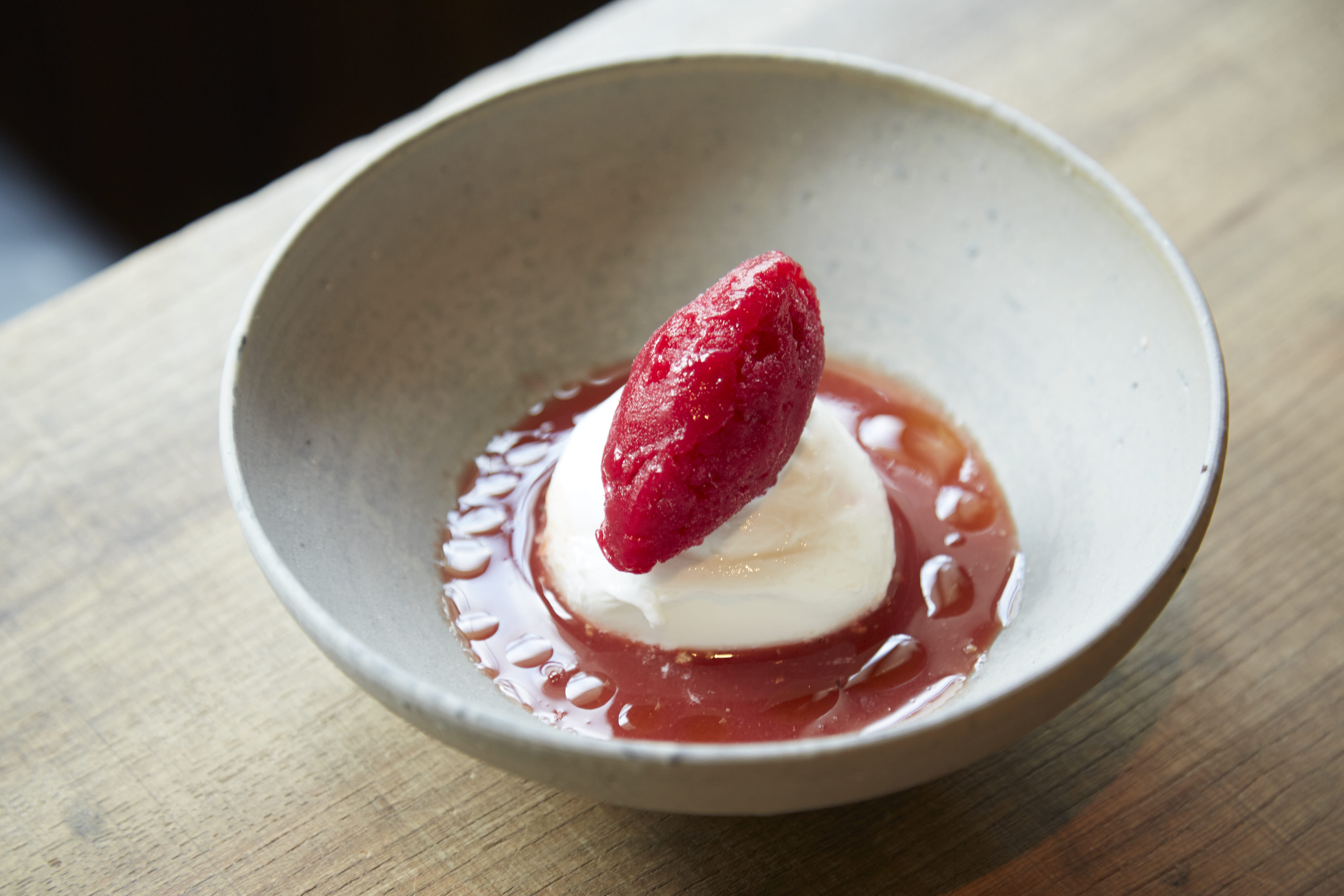 ソルダムとトマトのガスパチョの上に、モッツァレラをまるまるひとつ。オリーブオイルを垂らし、さらに、ビーツとオレンジのソルベをのせました。