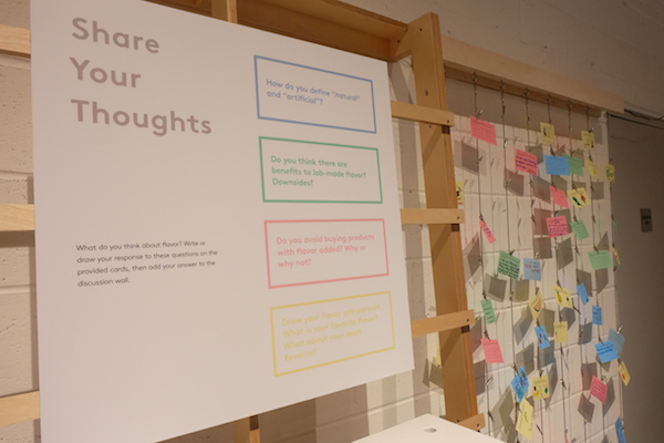 すべてのコーナーを体験したうえで、「自然と人工の境界線はどこにおくか」「作られた香料の利点は何だと思うか」「香料が添加された食品をどう考えるか」「自分の好みのフレーバー」などについてその人なりに考え、この企画展の感想とともにボードにコメントを貼っていきます。お決まりの答えを用意するのではなく、こうしたワークショップ形式で締めくくるのは、アメリカ的なスタイルといえるかもしれません。