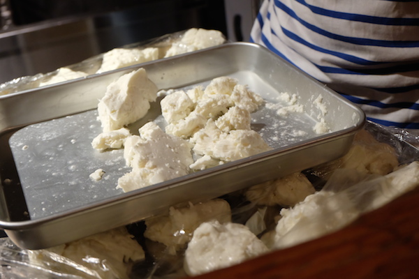これがカード(凝固乳)。乳酸菌や凝乳酵素の力を借りてミルクが固まったもので、木綿豆腐のような感じです。