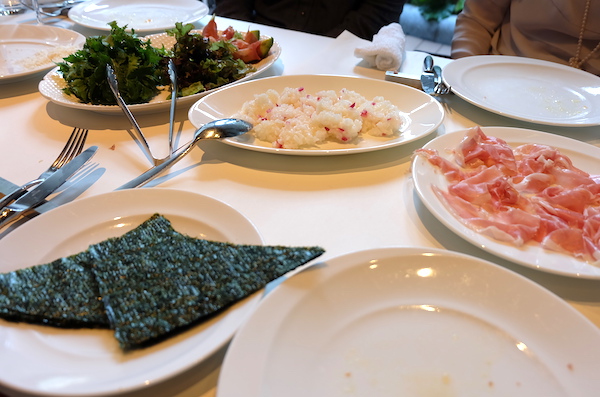 酢飯にも、ひと工夫。通常の甘みの強いすし酢ではなく、この日は赤玉ねぎのみじん切り、ビネガー、オリーブオイルを使用。「イタリア風酢飯」とでも言ったら良いでしょうか。細かに削ったパルミジャーノ・レッジャーノも加えて巻いてみても美味。焼き海苔の磯の香りも伴って、まさに山海の幸といった味わいでした。
