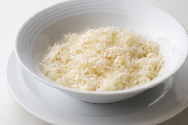 炊いた白米にオリーブオイルを和えて、パルミジャーノ・レッジャーノをたっぷりと削り下ろす・・・とても簡単ですが、日本人の心をくすぐる一品です。