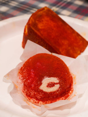 広島カープの大ファンでもある松原さんの限定生産チーズ。“赤ヘル”の形をしたチーズはシェーヴル、奥のチーズはブラウンスイス種の牛乳製のチーズです。いずれも金沢でつくられる甘辛い赤唐辛子をまぶしたチーズですが、見た目ほど辛くなく、ピリリとしたアクセントに。