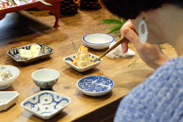 お正月用の盛り付けには、黒い漆塗りのベースの上に、白と青の色のトーンのみ統一させ、形はさまざまな皿を使用。さらに、赤い漆塗りの盃を組み合わせて、さらに変化を出してみました。