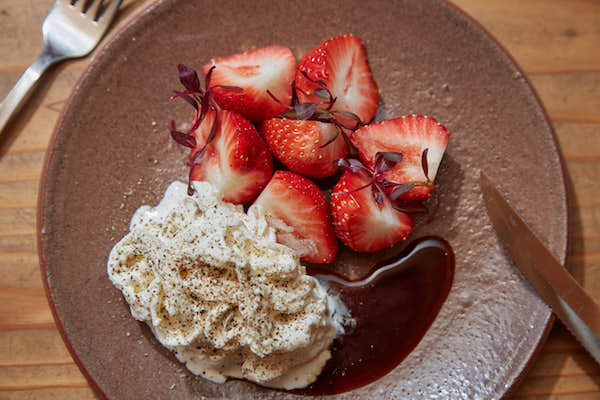ストラッチャテッラには、黒胡椒とフルール・ド・セル(塩)をかけ、オリーブオイルで調味。いちごはカットしたままで、マイクロリーフを添え、味わいとしては全体をビーツのソースでまとめあげています。ビーツは丸ごと、皮ごと使って、水、ビネガー、砂糖、クローブやタイムなどのハーブ&スパイスと一緒に煮詰めて、ソースにしています。
