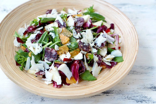 1 リコッタサラータは、スライサーで細長く削る。蝦夷鹿のサラミは薄く切り、りんごと柿はいちょう切りにする。トレビス、ルッコラ、クレソンの野菜類は、洗ったら食べ易い大きさに手でちぎって水気を取る。