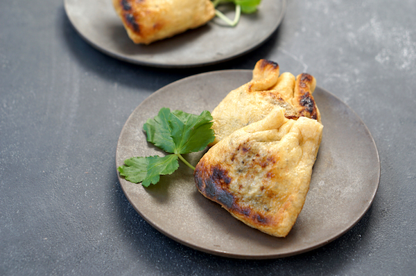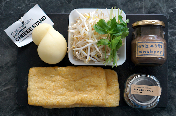 油揚げにカチョカヴァッロ、もやし、三つ葉を詰めて、網にのせて焼く“巾着(きんちゃく)”の簡単レシピです。