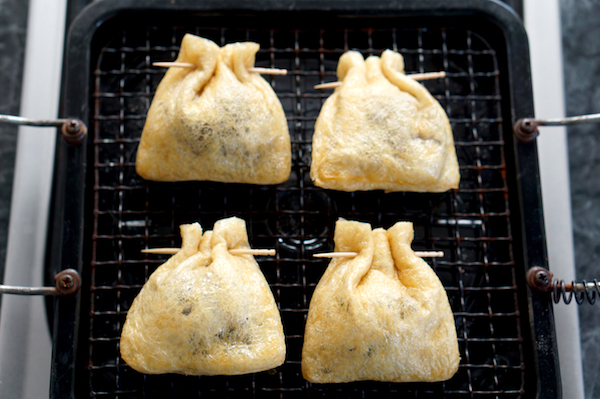 3 1の油揚げ4枚に2をそれぞれ詰め、爪楊枝で口を閉じる。熱した焼き網にのせて、焦げ目が付くまで表裏こんがり焼く。爪楊枝を外し、皿に盛る。