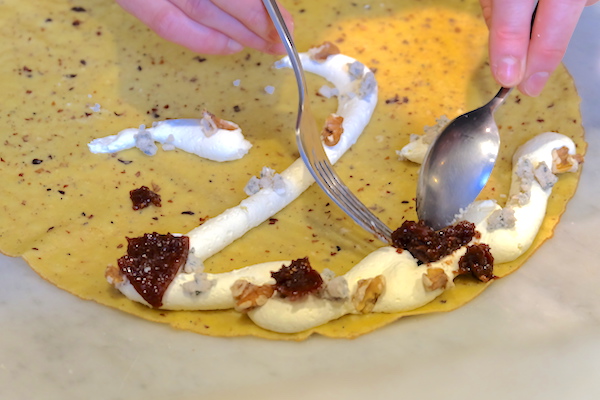 巻いた時にベストな状態になるよう、まずは特製のホイップクリームをまるで絵を描くかのようにしぼり、そこに、ローストしたくるみ、自家製のいちじくの赤ワイン煮、そして、ブルーチーズを丁寧にのせていきます。