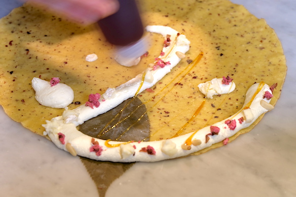 「まさに春!」といったクレープ。さらに、食感のアクセントになる松の実と、奥行きのある甘さを生む蜂蜜がプラスされます。