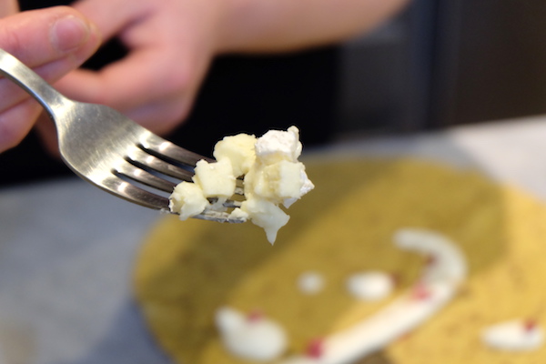 赤ワイン香るいちじくの豊かな甘みに、くるみの香ばしさ、さらに、ケソ・デ・バルデオンの塩気とブルーチーズならではの香りが合わさることで、絶妙な味わいが生まれます。上質な生地がそれをしっかりと包み込むことで、完成するこのクレープ。お酒も好きという大人のチーズLOVERには、ぜひ一度体験してほしい一品です。