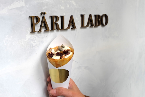 「EAT SWEETS, & WORK HARDER !」。「PÄRLA LABO」の外壁にはこんな言葉も。アイデアと情熱がたっぷりと注ぎ込まれたクレープは一食の価値あり。確かに、スペシャルなチーズが入ったここのクレープを堪能すれば、なんだかチャレンジする力が湧いてくるかも(!?)