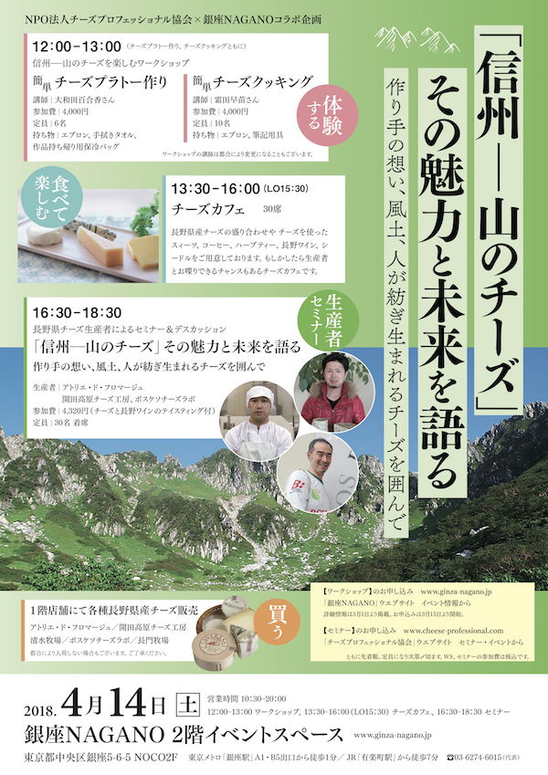 2018年4月14日(土)、東京・銀座5丁目にある長野県のアンテナショップでは、目で見て、耳で聞いて、頭で学んで、手で作って、舌で味わって・・・と、全身でたっぷり信州のチーズを堪能できるイベントが開催されます。