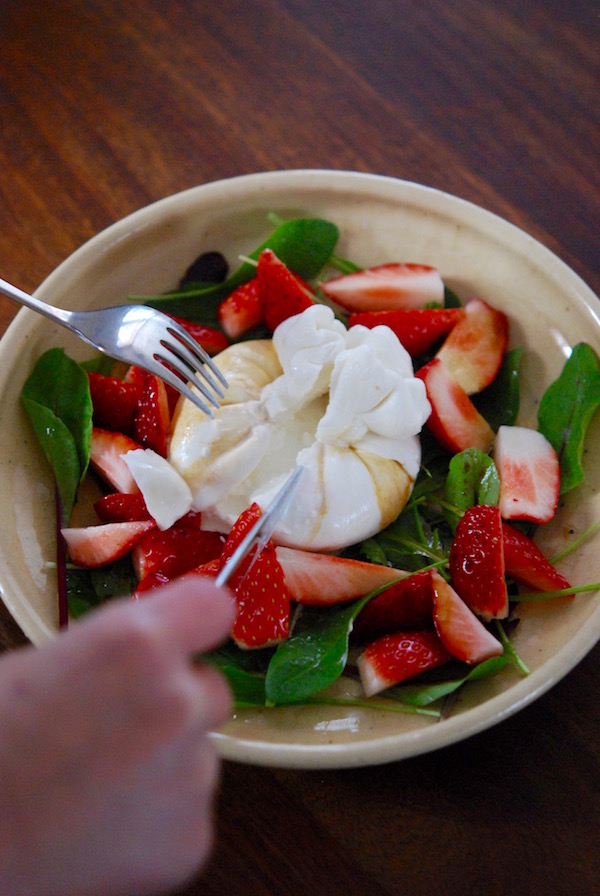 ぷっくりとした袋部分ににナイフを入れると、ストラッチャテッラがとろり。クセもないので、誰でも食べやすいチーズです。この季節はいちごを合わせて食べるのがおすすめです。
