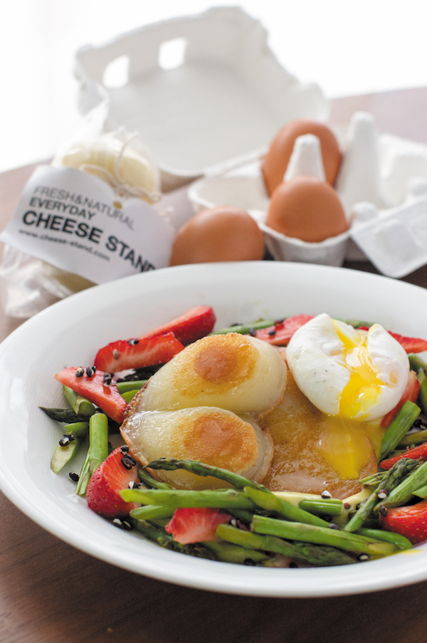 見た目にも春らしいイチゴとアスパラガス、ポーチドエッグをのせたホットサラダは、食事として十分な一皿になります。