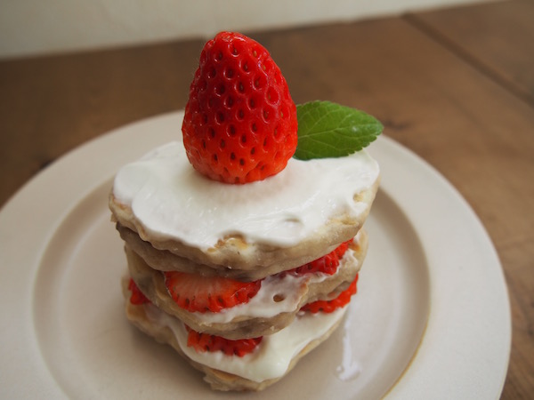 バナナ入りのパンケーキを焼いてフロマージュブランとイチゴでデコレーションするだけで、この可愛らしさ。パパとママも取り分けて同じケーキでお祝いができる、大人が食べても美味しいケーキです。