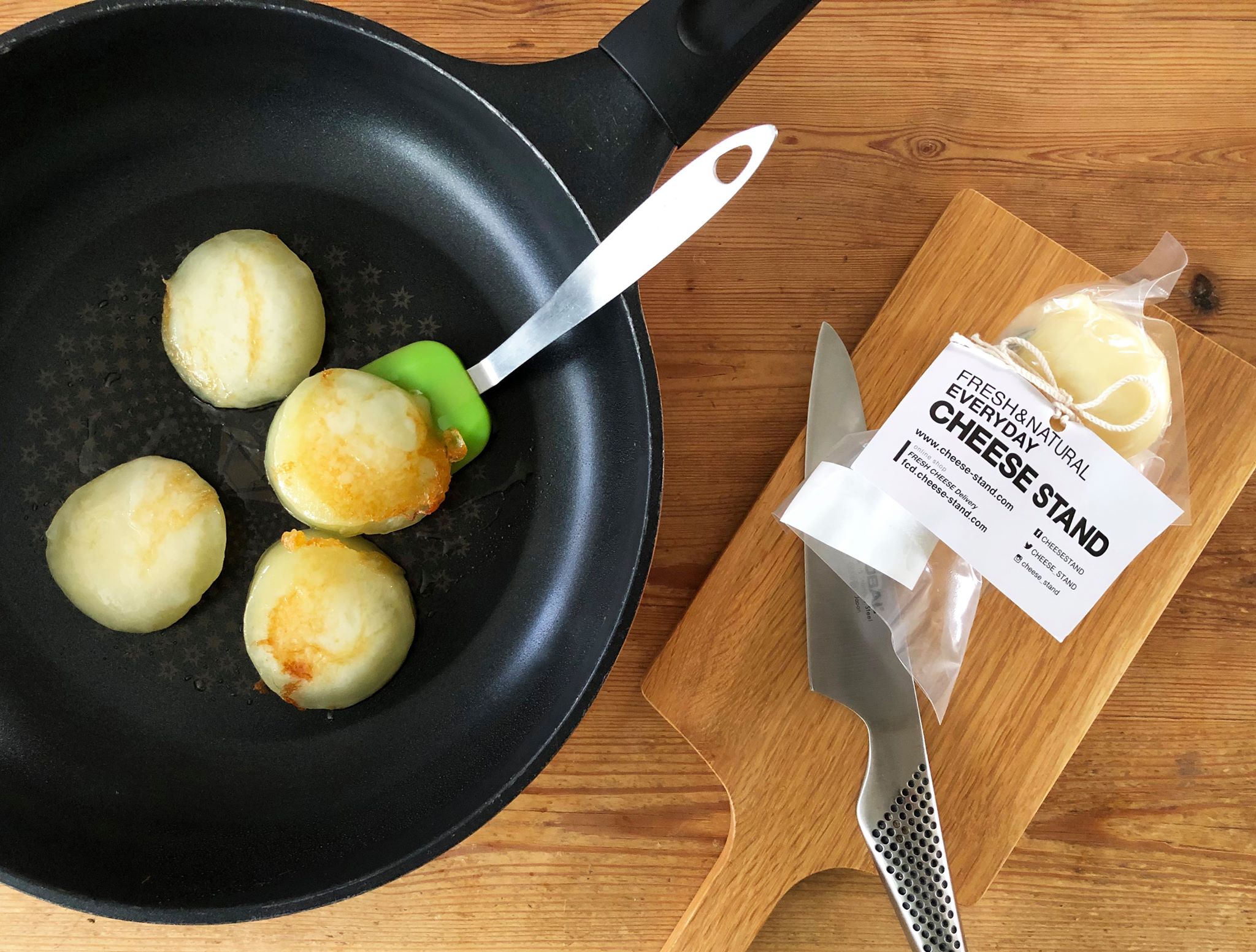 フライパンの上にのせて中火で焦げ目をつけます。裏返して反対側も軽く焼いてください。