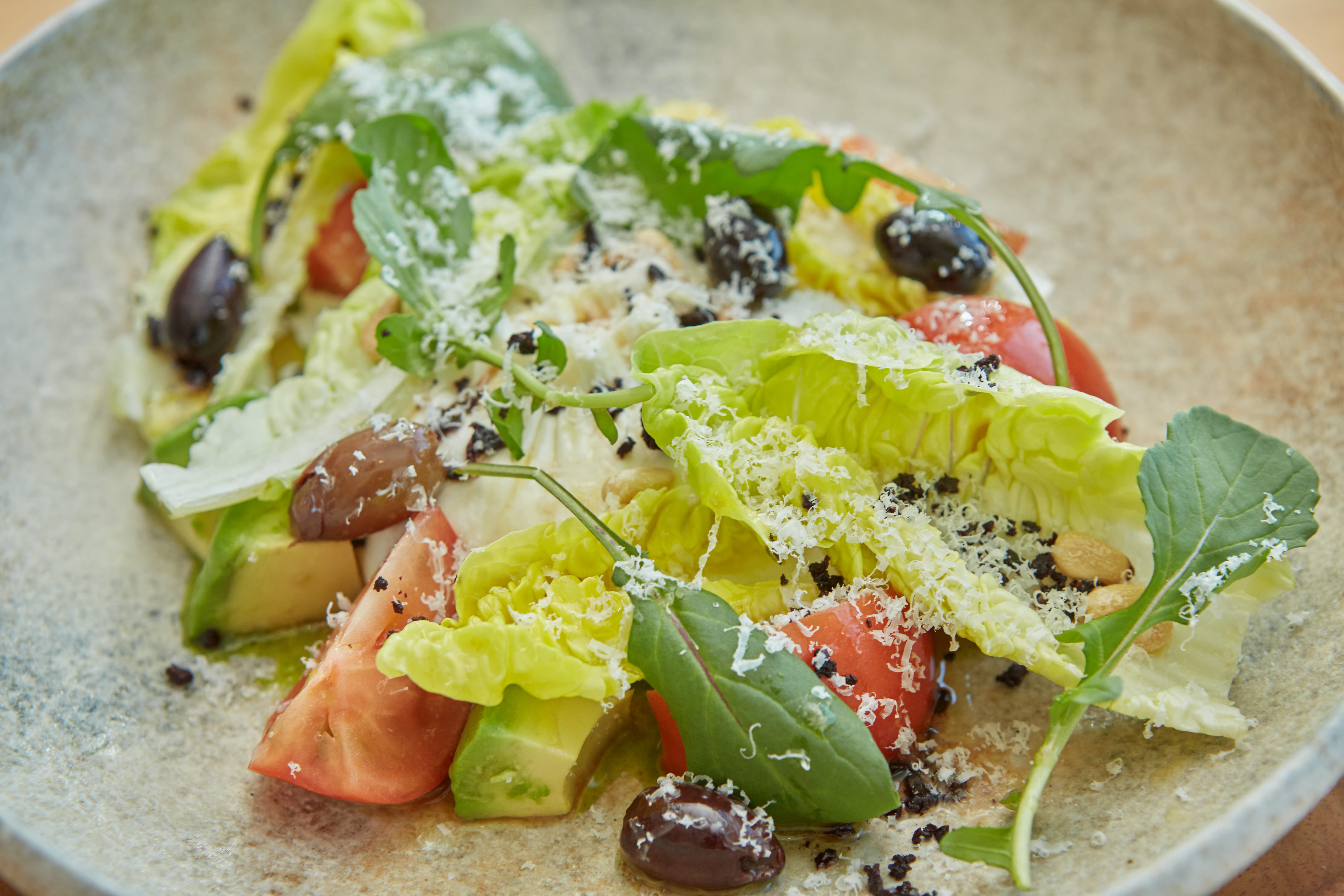 味付けはシンプルに塩とオリーブオイルとシェリービネガーのみを使い、トマトやアボカドで酸味や甘み、ルッコラとブラックオリーブで程よい辛味と苦味も感じていただきながら、チーズの味わいを最大限味わっていただけるように味のバランスを組み立てました。