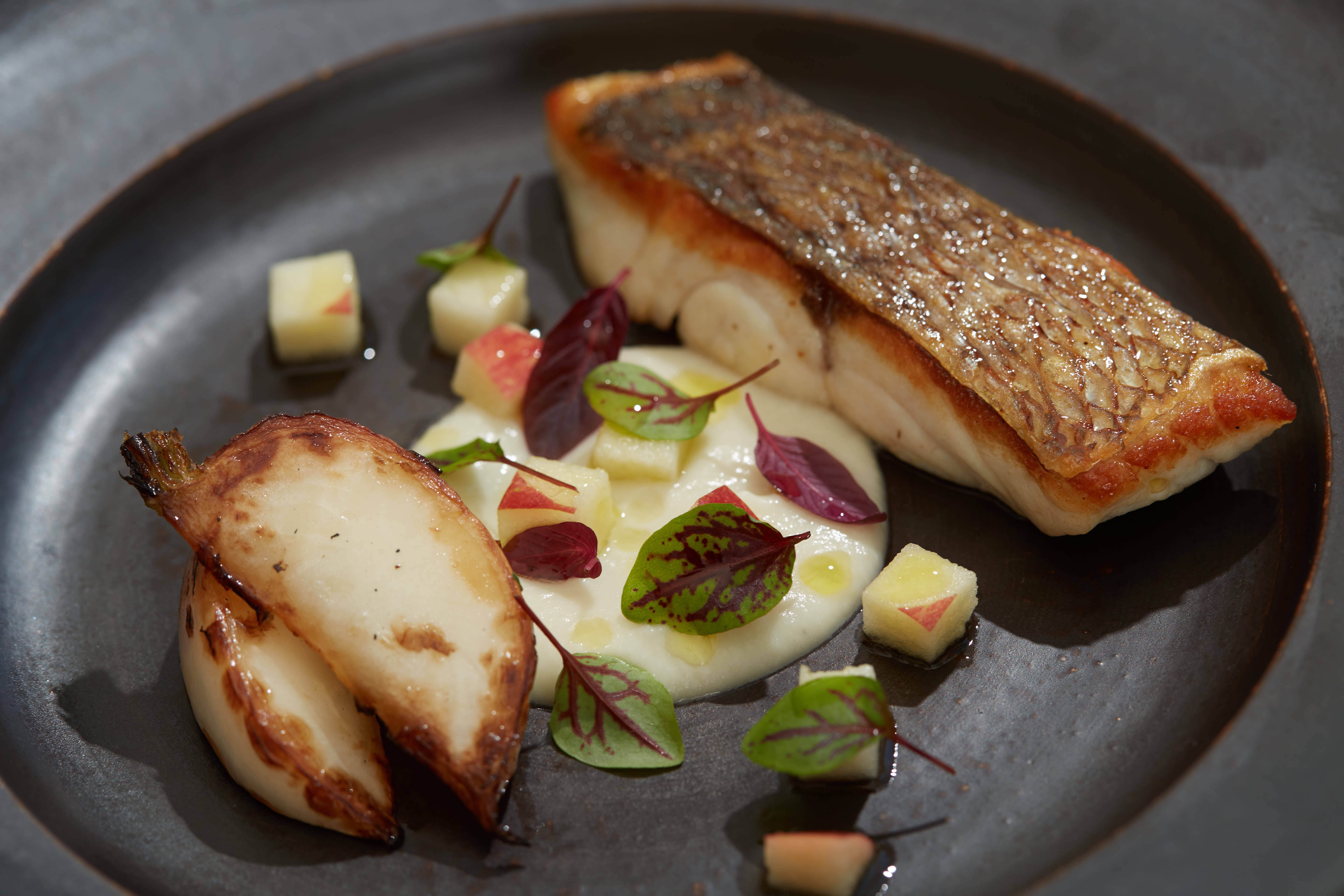 例えば、1月のお魚料理「鮮魚のパンフライ 蕪のグリルとソース オゼイユ 林檎」は、ゲストに冬らしさを感じていただけるように、全体を白でまとめました。グリルした蕪の香ばしさと、蕪のピューレのコク、ビネグレットであえたフレッシュな林檎の甘酸っぱさの絶妙なバランスを楽しんでいただけます。