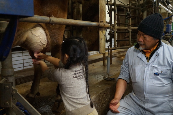 毎週日曜日には「乳搾り体験教室」(13時〜、要予約 参加費一人700円)が開かれ、牧場主の磯沼正徳さんの“乳搾り体操”に始まるレクチャーを受けて、人の体温よりちょっと温かいミルクを搾ることができます。天然、自然の乳液を顔や手に塗ってみる、なんてこともOK!