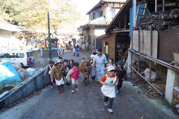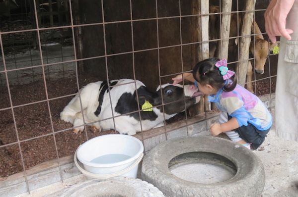 生まれたては30キロほどだった子牛も、数か月で100kgに。楽しいお散歩ですが、手綱を引いていても子牛が走り出したらモ~大変。「八王子で子牛が脱走!」なんてニュースにならないように、必ず大人が側にいて、見守ってあげてください。