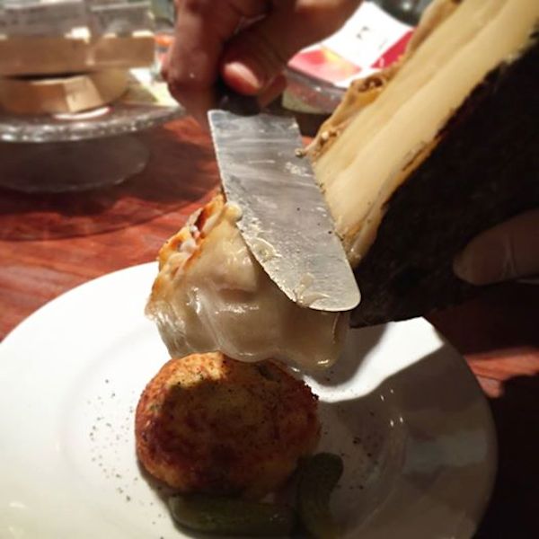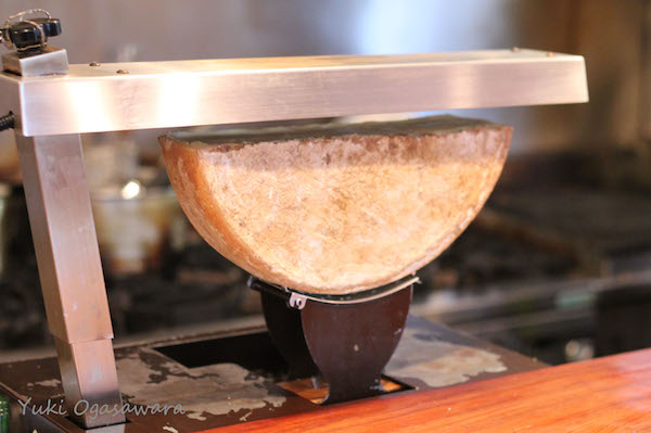 ラクレットは、直径約30㎝もあるチーズを半分にカットし、その切り口を暖炉や焚火の炎にかざして溶けたところをナイフで削り、茹でたじゃがいもにかけていただくのがもともとの食べ方。